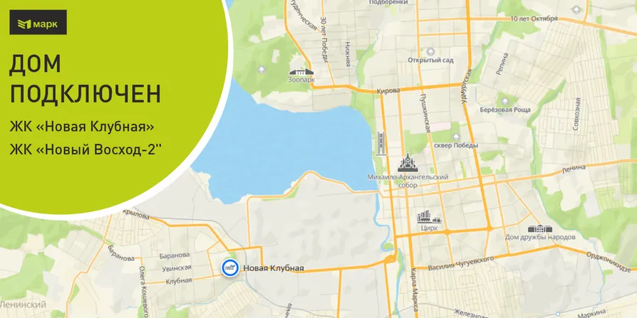 ЖК "Новый Восход - 2" по адресу ул. Воткинское шоссе, 53к1 и ЖК "Новая Клубная" по адресу ул. З.Космодемьянской, 15 - 6 секция уже с Интернетом от Марка!
